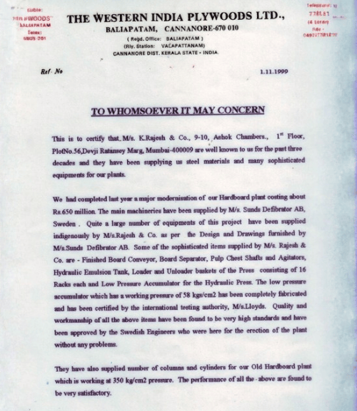 We are supplying some equipments like Finished Board Conveyor, Board Seperator, Pulp Chest and Agitators, Hydraulic Emulsion Tank, Loader and Unloader baskets of the Press consistng of 16 Racks each and low Pressure Accumulator for the hydraulic Press.